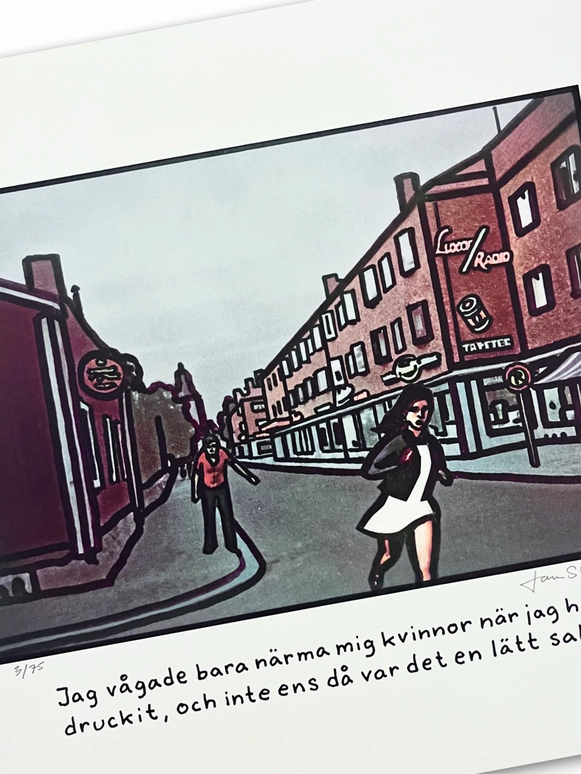 "Närma mig kvinnor." A fine art print by Jan Stenamark produced on 400 gsm Bockingford paper. The artwork has a paper size of 41 × 41 cm (approximately 16 × 16 inches) and an image area of 35 × 29 cm (approximately 14 × 12 inches). This edition is limited to 75 copies, and each print is signed and numbered by the artist.